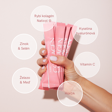 Zloženie: hydrolyzovaný rybí kolagén, mliečnan horečnatý, malinová aróma, sušená šťava z červenej repy, regulátor kyslosti: kyselina citrónová, glukónan železnatý, kyselina L-askorbová (vitamín C), citran zinočnatý, hyaluronát sodný, sladidlo: glykozidy steviolu zo stévie, glukónan meďnatý, seleničitan sodný.