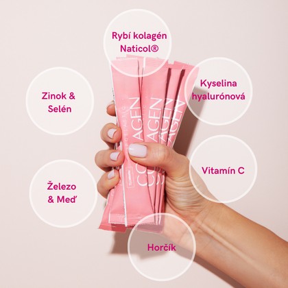 Zloženie: hydrolyzovaný rybí kolagén, mliečnan horečnatý, malinová aróma, sušená šťava z červenej repy, regulátor kyslosti: kyselina citrónová, glukónan železnatý, kyselina L-askorbová (vitamín C), citran zinočnatý, hyaluronát sodný, sladidlo: glykozidy steviolu zo stévie, glukónan meďnatý, seleničitan sodný.
